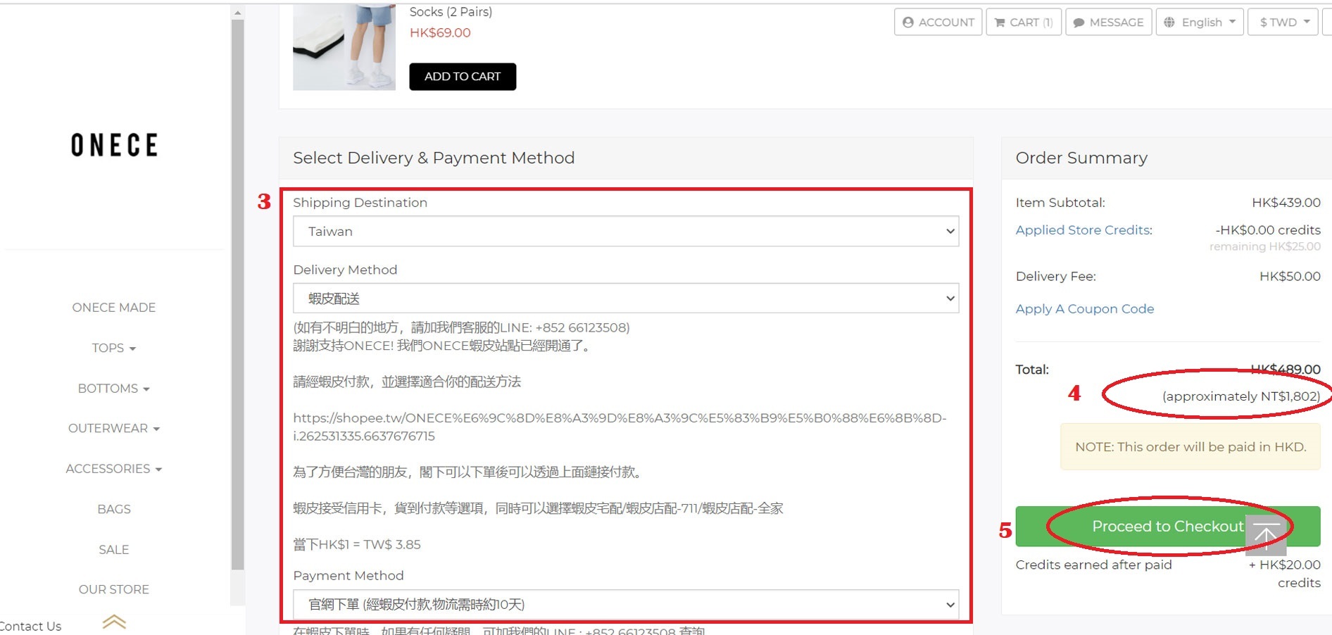 3. Remember the price quoted in NT$ (See circle 4, it is NT$1802 in this example) / 留意台幣的估算價(看4,範例顯示是NT$1802)